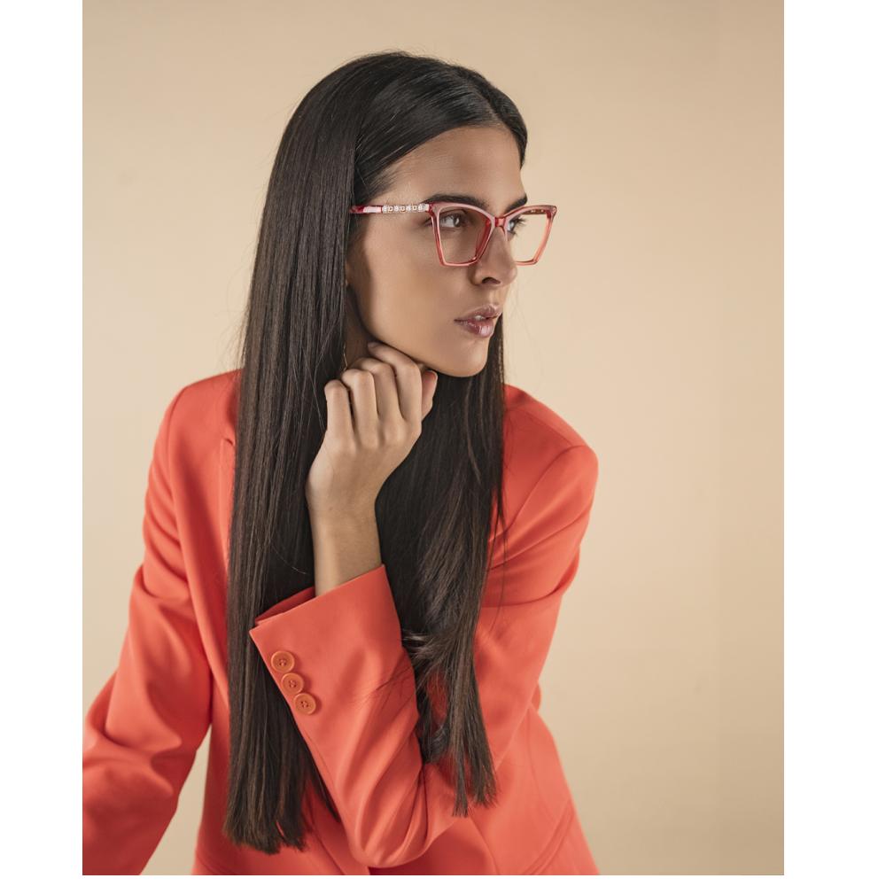 Optical frame in crystal coral acetate with rosegold metal temples and clear crystals