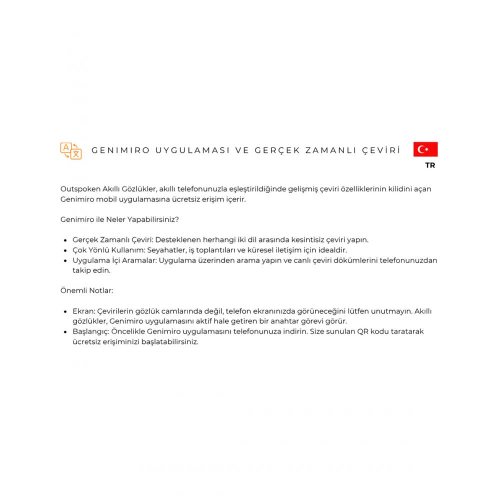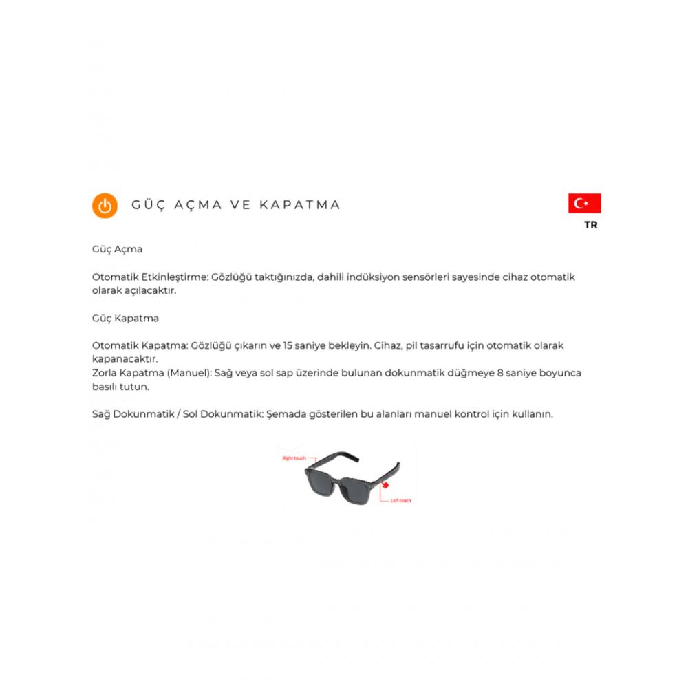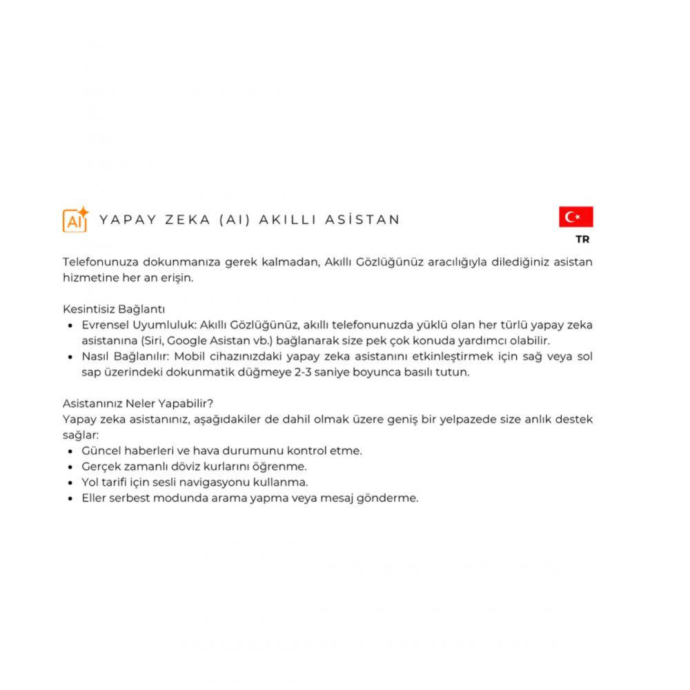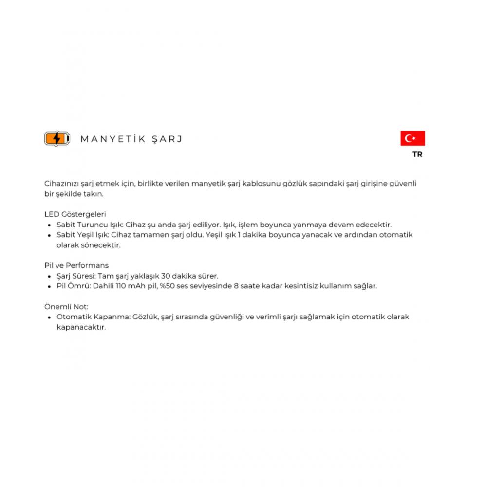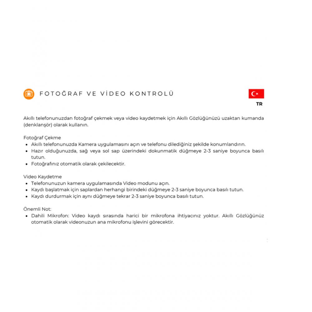 • Dahili Mikrofon: Video kaydı sırasında harici bir mikrofona ihtiyacınız yoktur. Akıllı Gözlüğünüz otomatik olarak videonuzun ana mikrofonu işlevini görecektir.